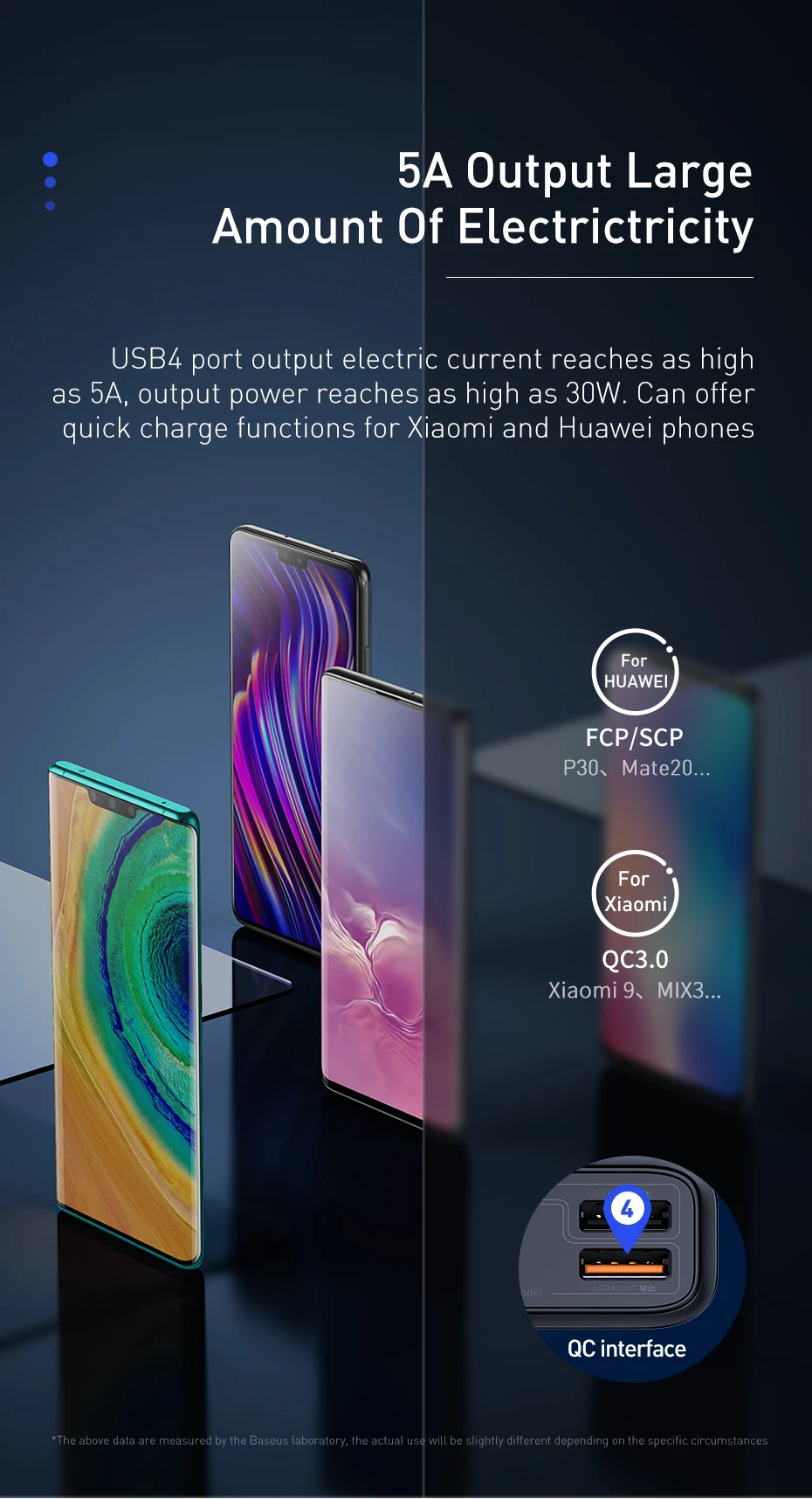 USB 4 Output:Â About 5V/4.5A,4.5V/5A,5V/3A,9V/3A,12V/2.5A,20V/1.5A 30W(SCPÂ QC3.0)
