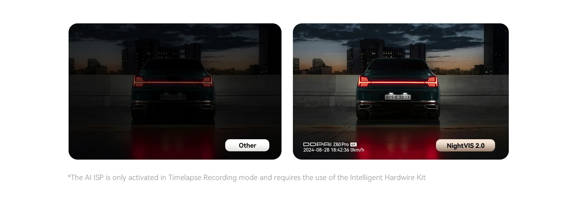 Powered by DDPAl’s advanced NiqhtVIS 2.0 technology and Al ISP image processing, the Z60Pro enhances night vision for parking monitoring, delivering brighter and clearer footage even in the darkest environments.