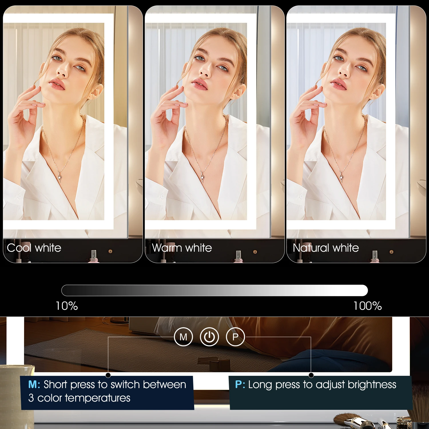3 Modes de couleur : Blanc froid (maquillage de jour), Blanc neutre (extérieur), et Jaune chaud (soirée/événement).