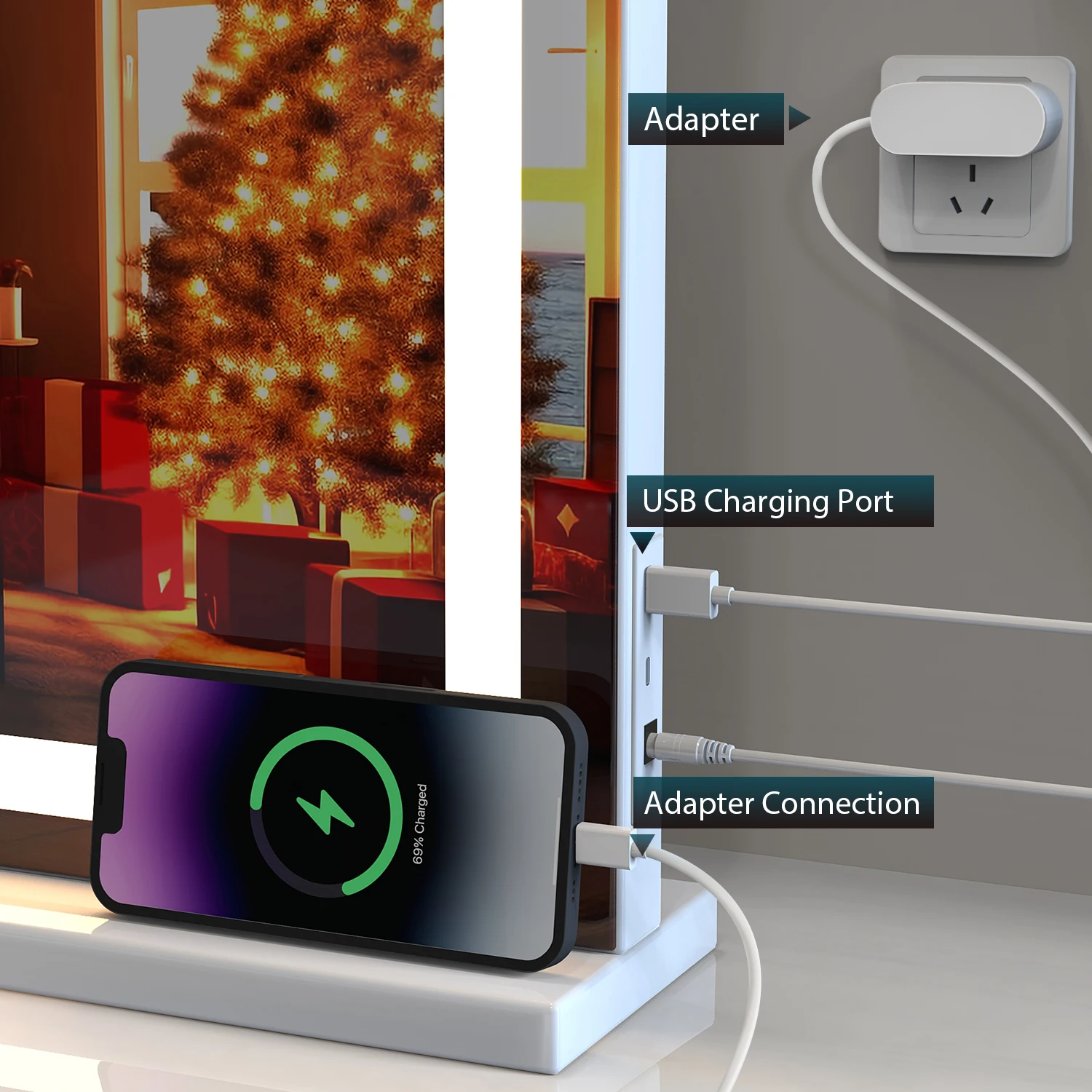 Fini la batterie faible pendant que vous vous préparez. Un port USB latéral vous permet de recharger votre téléphone ou de brancher vos accessoires de beauté (brosse chauffante, etc.) directement sur le miroir.