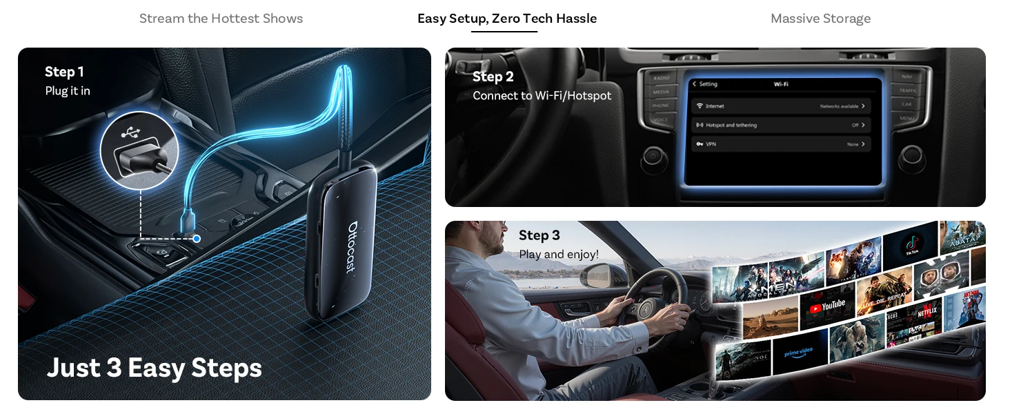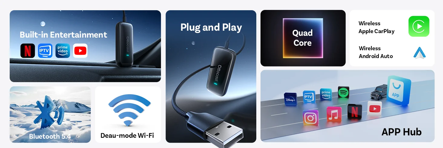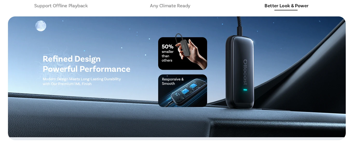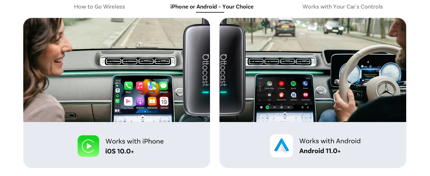 Dites adieu aux câbles emmêlés. Une fois branchée, l’OTTOCAST convertit votre système filaire en CarPlay et Android Auto sans fil.