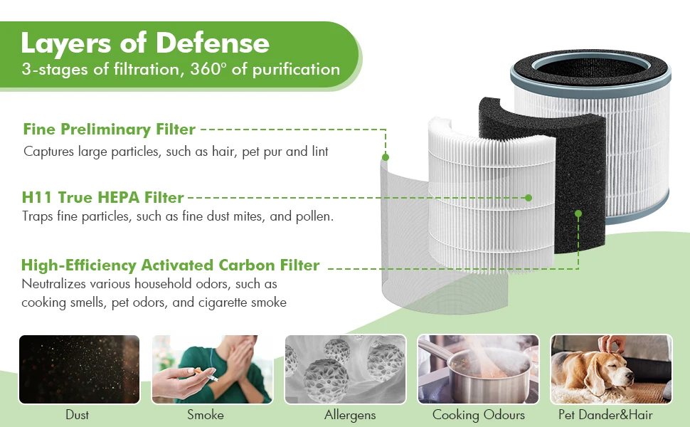 | Type de Filtre | True HEPA + Pré-filtre + Charbon Actif |