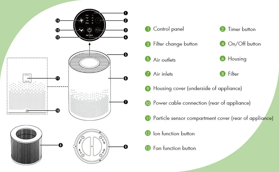 Ioniseur : Émet des ions négatifs qui précipitent les poussières au sol et éliminent les mauvaises odeurs (tabac, cuisine).
