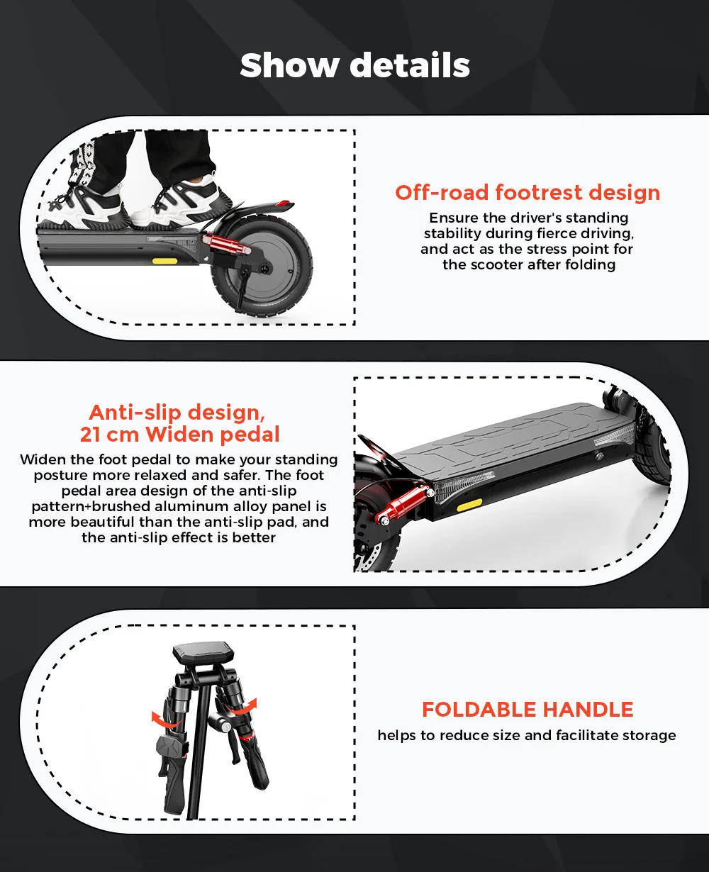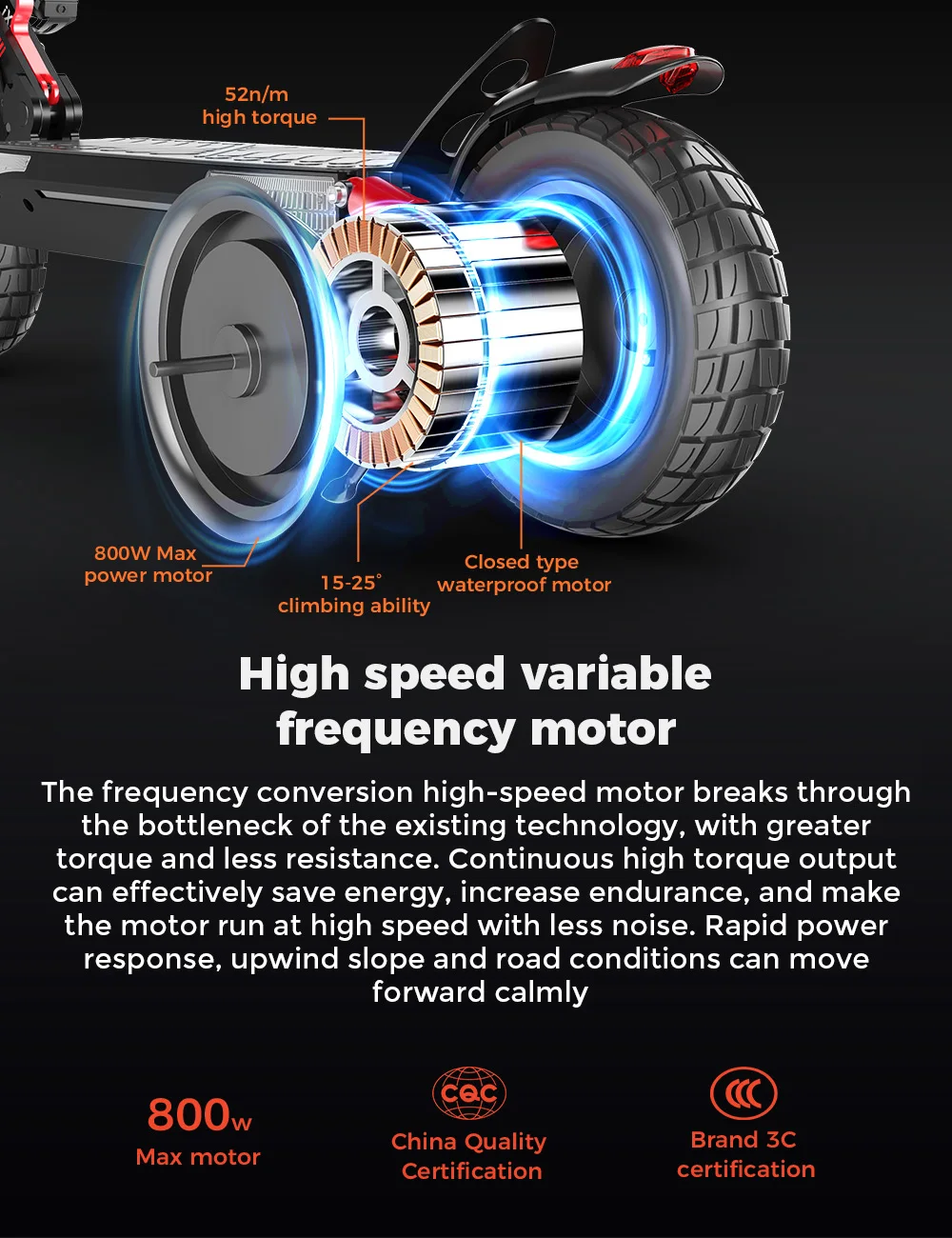 Conquer rough terrains with an 800W high-torque motor and 10″ anti-explosion pneumatic tires, designed for speed and stability.