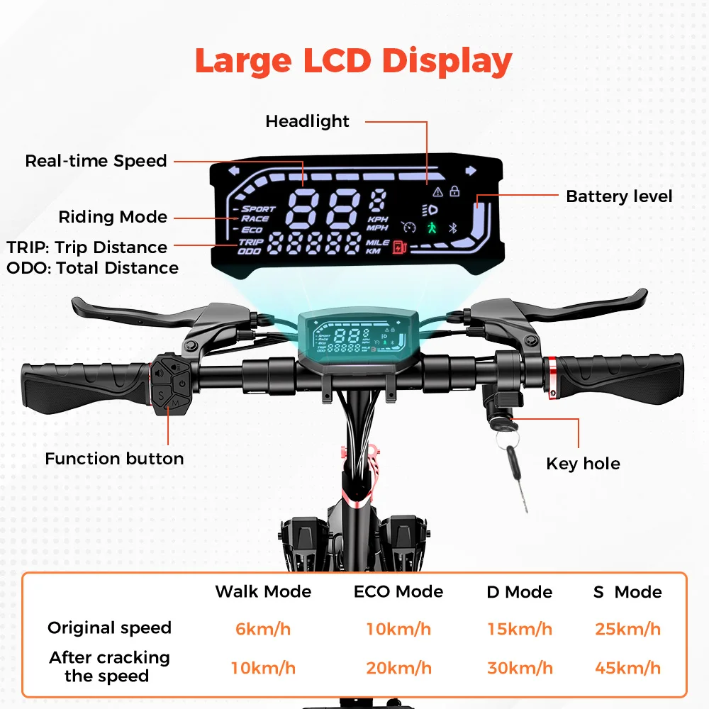 Enjoy up to 40 km range with the 48V 10Ah battery, ideal for daily commutes or adventurous off-road trips.